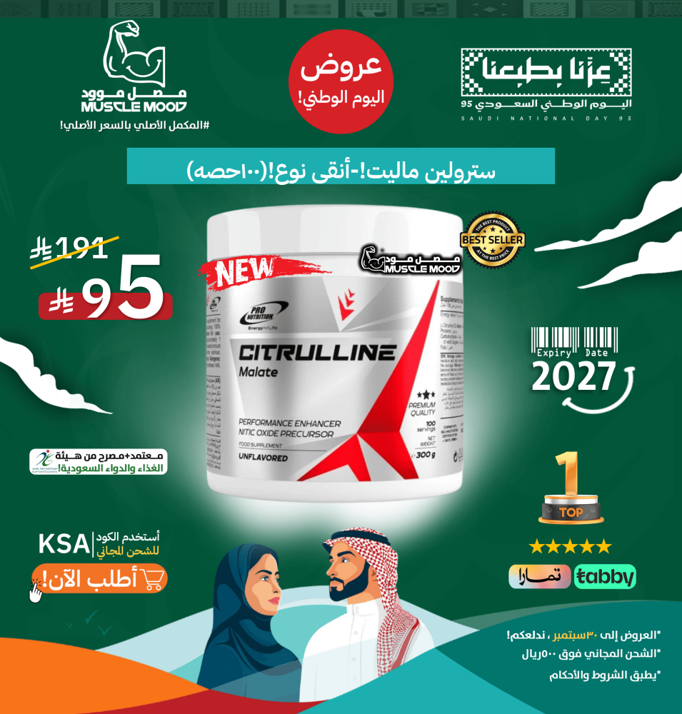سيترولين مالات: غذاء تكميلي لبناء الجسم. لا يستخدم لمن هم دون 18 سنه.